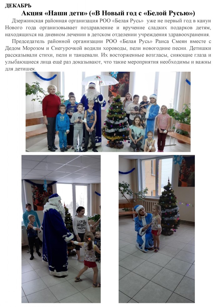возможность отпраздновать его весело в кругу семьи. И причины тому разные… Одна из них – болезнь. И, чтобы хоть немного поднять ребятам, находящимся на лечении в детском отделении Дзержинской ЦРБ, настроение, к ним направились с подарками Дед Мороз , Снегурочка (члены первичной организации ГУО «Средняя школа № 4 г.Дзержинска» и председатель Дзержинской РО РОО «Белая Русь» Раиса Смеян.