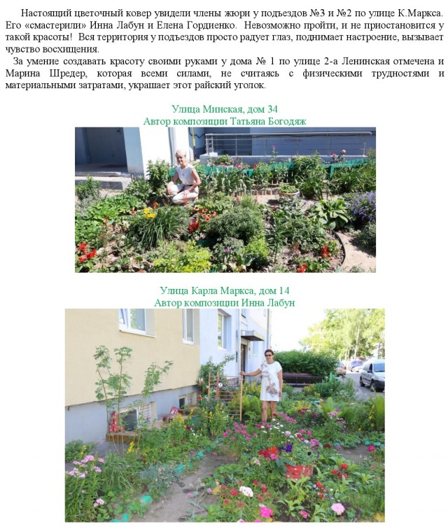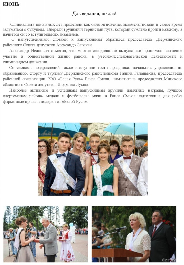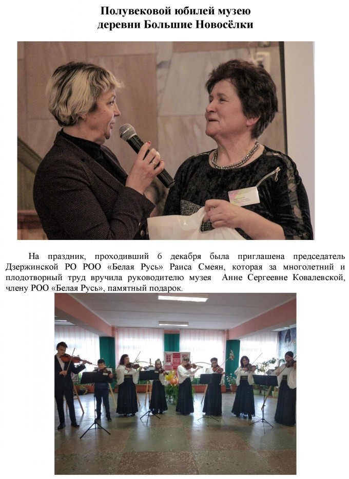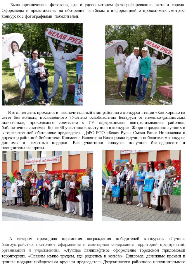 Председатель Дзержинской районной организации РОО «Белая Русь» Раиса Смеян была приглашена на праздник и ей была предоставлена возможность поздравить присутствующих и высказать слова благодарности за добросовестный самоотверженный труд. Также на главную сцену праздника она пригласила активистов первичных организаций Чуйко Юрия Васильевича (Инспекция Министерства по налогам и сборам Республики Беларусь по Дзержинскому району), Сенько Юрия Ивановича, (РУ «Дзержинскгаз»), Вирную Людмилу Викторовну (Дзержинский районный узел почтовой связи). Им были вручены благодарности и памятные подарки от Дзержинской районной организации РОО «Белая Русь» за добросовестный труд, активное участие и высокую ответственность при выполнении задач объединения.