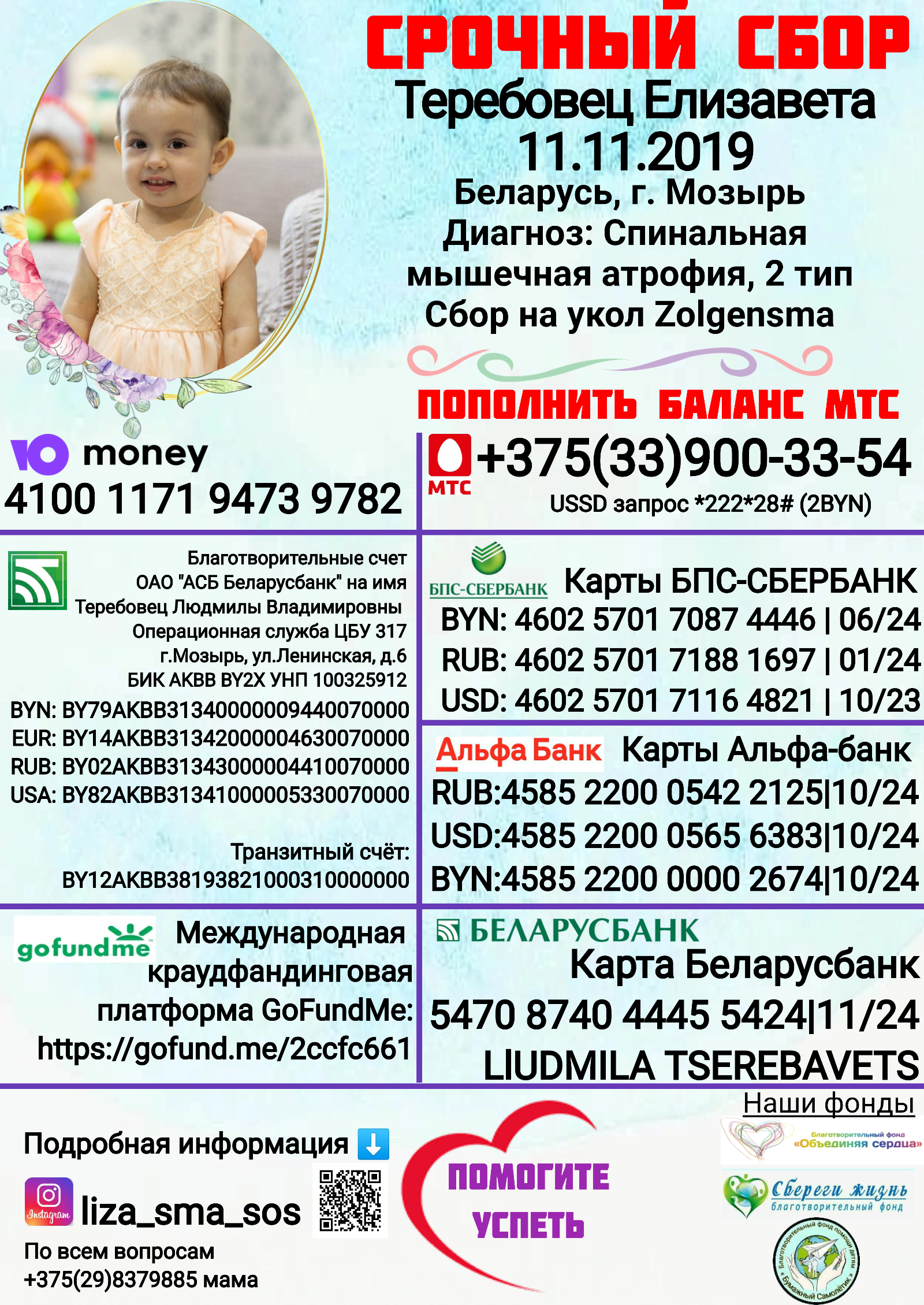 Остановить болезнь можно, но цена препарата очень и очень высока. Стоимость препарата Золгенсма примерно 2 000 000$. Этот укол делают один раз, но только до двух лет. Мы очень хотим успеть спасти своего ребенка. Дать шанс ему жить полноценной, счастливой жизнью. Мотонейроны в организме нашего ребенка без лечения гибнут каждую минуту. Мы не можем ждать! Мы уже начали активную работу по сбору средств: открыты благотворительные счета и оформлены карты в банках, создан аккаунт в социальных сетях, к нам присоединилась команда волонтеров, обратились в Березовский райисполком, районную газету «Маяк», на предприятия. В связи с изложенным просим Вас, оказать информационную поддержку. Просим Вас разместить информацию о нашей беде и срочности сбора в вашем издании.