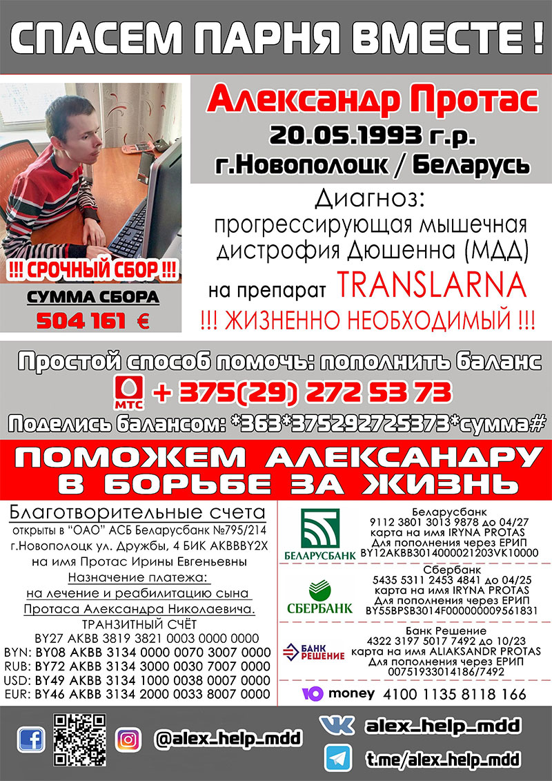 На сегодняшний день в Республике Беларусь зарегистрировано лекарственное средство «Трансларна» производство PTC Therapeutics. Это единственное лекарство в мире при данной поломке, которое так необходимо Александру. «Трансларна» восстанавливает синтез полноразмерного белка и коренным образом меняет течение болезни. Стабилизирует общее состояние, дыхательную и сердечно сосудистую систему и тем самым увеличивает продолжительность жизни.