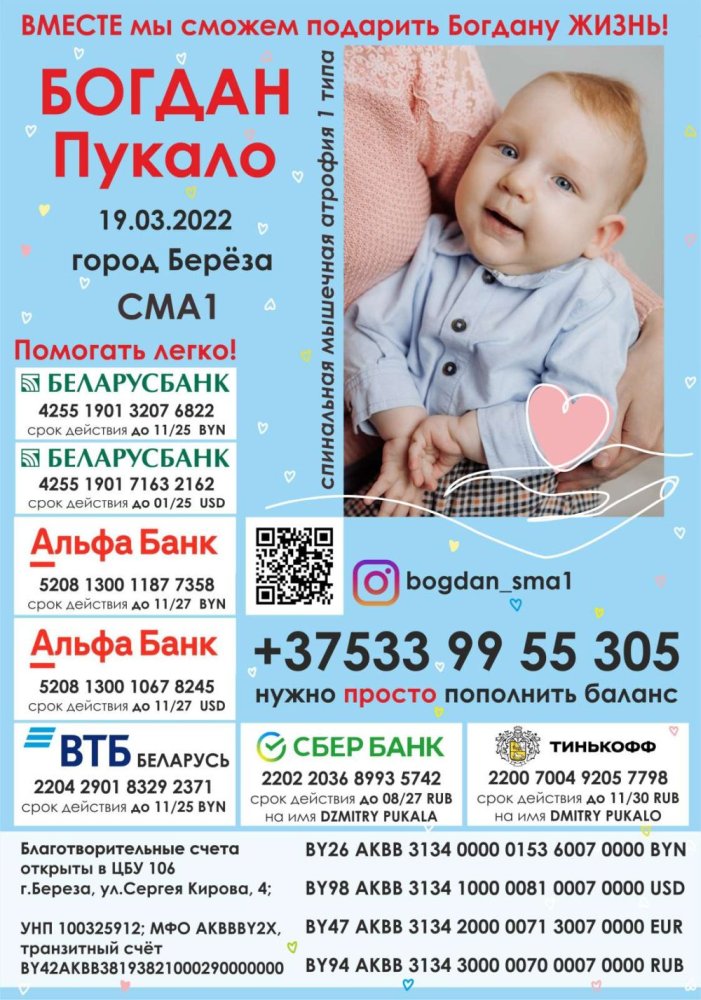 31 октября 2022 г. нашему сыну, Пукало Богдану, поставили диагноз – спинальная мышечная атрофия 1 типа (СМА1). СМА1 – редкое, но крайне опасное генетическое заболевание, которое вызывает мышечную слабость. Заболевание носит прогрессирующий характер, слабость начинается с мышц ног и всего тела и с развитием заболевания доходит до мышц, отвечающих за глотание и дыхание. СМА 1 типа наиболее агрессивна. Без лечения дети, как правило, не доживают до двух лет. На текущий момент мы, родители, отмечаем нарастающую мышечную слабость. Богдану 8 месяцев, он не удерживает голову, не переворачивается, не сидит, не ползает. При СМА разработана патогенетическая терапия, применяется один из лекарственных препаратов: -Укол Золгенсма, колется 1 раз и на всю жизнь. -Спинраза, колется 3 раза в год на протяжении всей жизни. -Капли Эврисди потребляются внутрь ежедневно на протяжении всей жизни. Все эти препараты стоят сотни тысяч долларов. Указанные лекарственные препараты не включены в Республиканский формуляр лекарственных средств, перечень основных лекарственных средств и клинические протоколы диагностики и лечения детей с патологией нервной системы, в связи с чем, обеспечение ими может быть осуществлено за счет личных средств или иных не запрещенных законодательством источников.