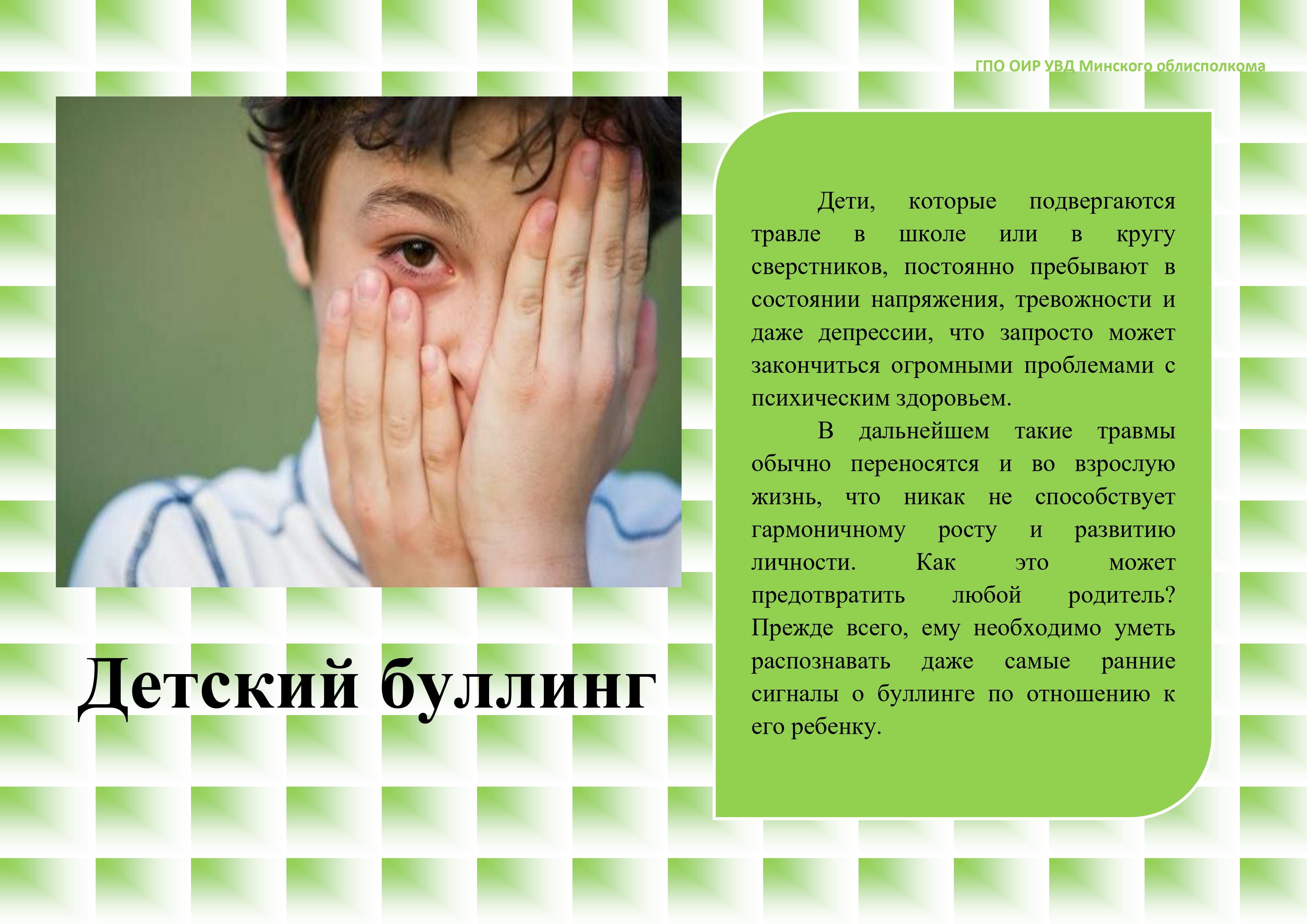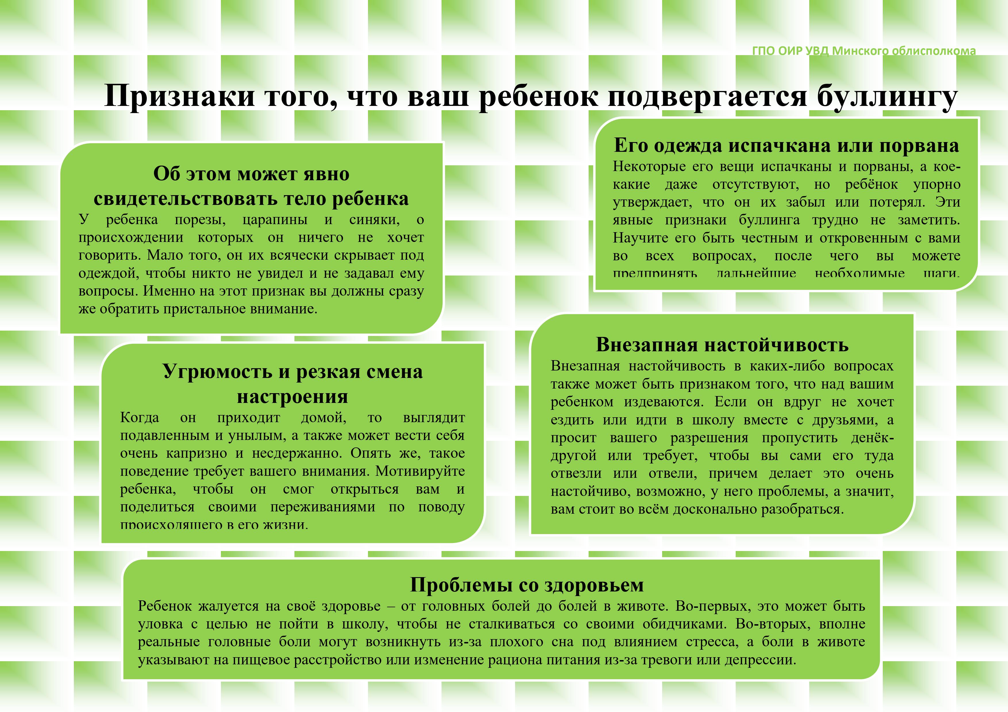 Статья 9 Закона Республики Беларусь «О правах ребенка»: «Лица, которым стало известно о фактах жестокого обращения, физического и (или) психического насилия в отношении ребенка, представляющих угрозу его жизни, здоровью и развитию, обязаны немедленно сообщить об этом в компетентный государственный орган». О ФАКТАХ СЕМЕЙНОГО НЕБЛАГОПОЛУЧИЯ И ЖЕСТОКОГО ОБРАЩЕНИЯ С ДЕТЬМИ МОЖНО СООБЩИТЬ ПО ТЕЛЕФОНУ КРУГЛОСУТОЧНОЙ ПРЯМОЙ ЛИНИИ МИНИСТЕРСТВА ВНУТРЕННИХ ДЕЛ ПО ПРИЕМУ СООБЩЕНИЙ О ФАКТАХ СЕМЕЙНОГО НЕБЛАГОПОЛУЧИЯ И НАСИЛИЯ В ОТНОШЕНИИ ДЕТЕЙ 8-017 372-73-87 Милиция общественной безопасности МВД Республики Беларусь |