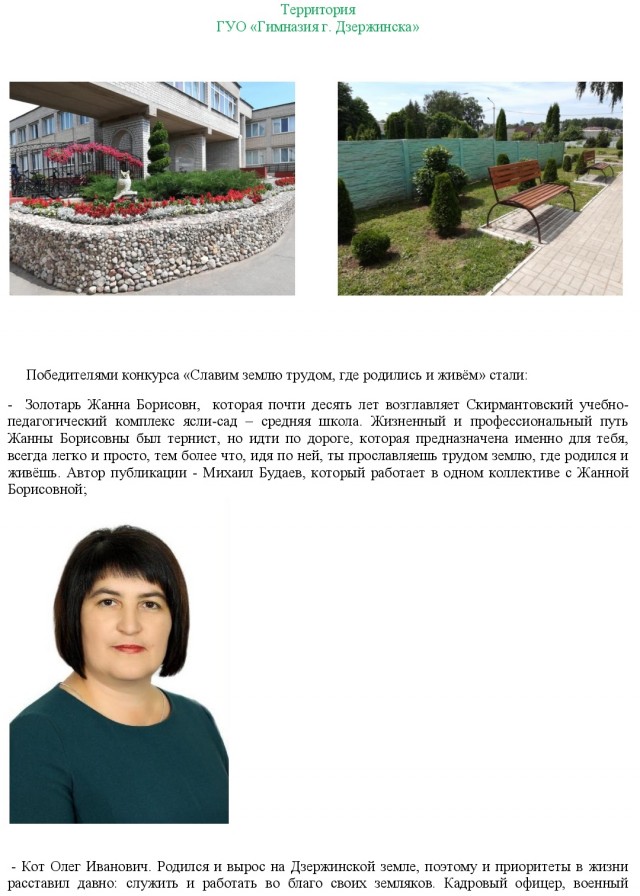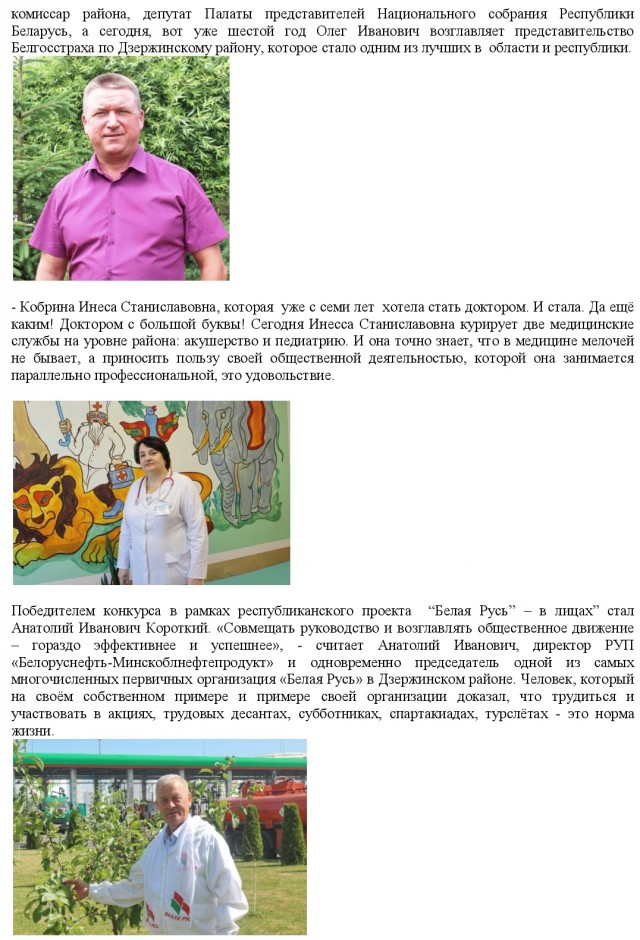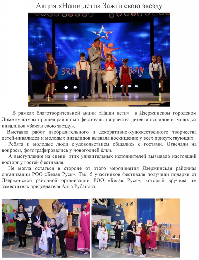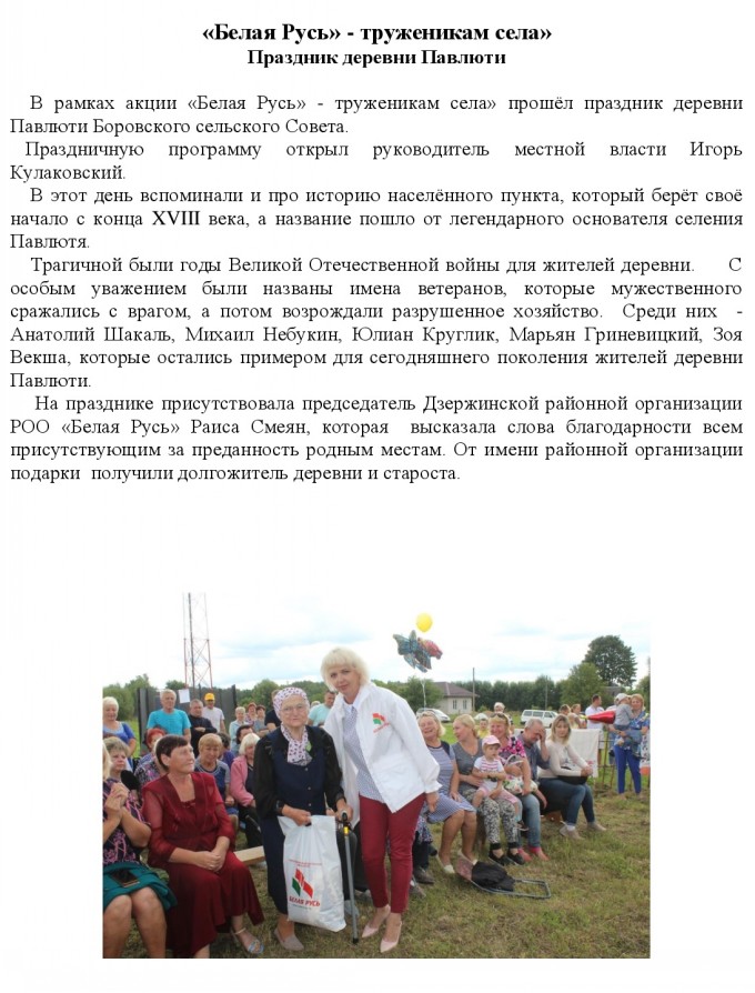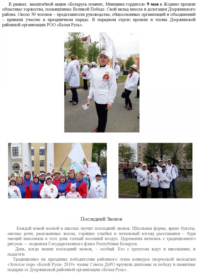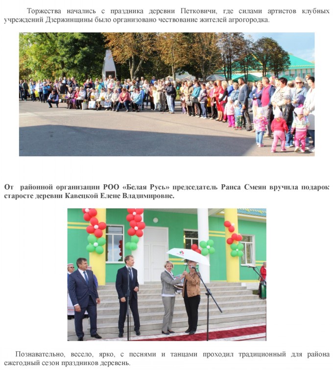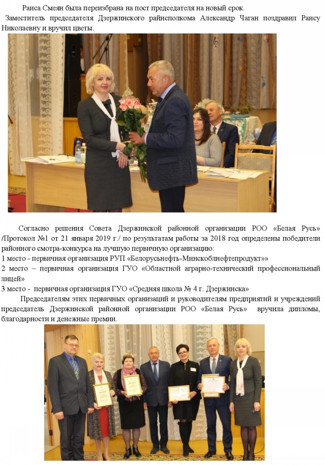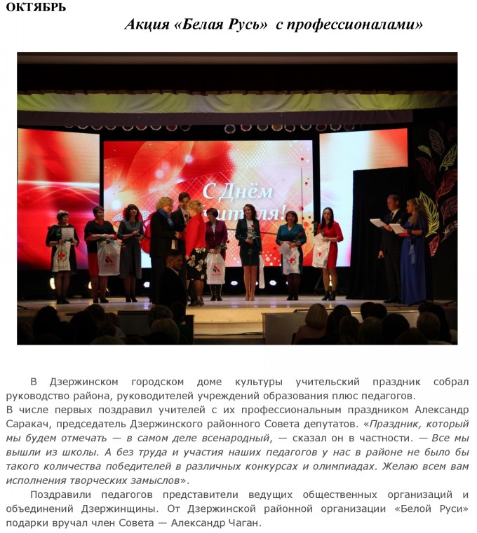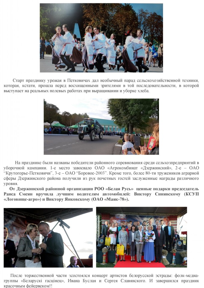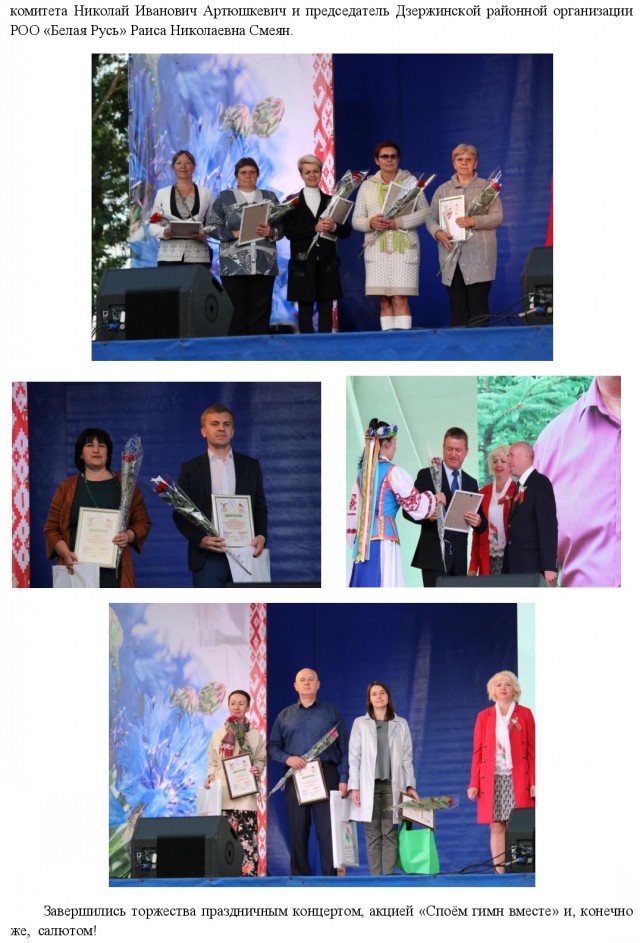 Председатель Дзержинской районной организации РОО «Белая Русь» Раиса Смеян была приглашена на праздник и ей была предоставлена возможность поздравить присутствующих и высказать слова благодарности за добросовестный самоотверженный труд. Также на главную сцену праздника она пригласила активистов первичных организаций Чуйко Юрия Васильевича (Инспекция Министерства по налогам и сборам Республики Беларусь по Дзержинскому району), Сенько Юрия Ивановича, (РУ «Дзержинскгаз»), Вирную Людмилу Викторовну (Дзержинский районный узел почтовой связи). Им были вручены благодарности и памятные подарки от Дзержинской районной организации РОО «Белая Русь» за добросовестный труд, активное участие и высокую ответственность при выполнении задач объединения.