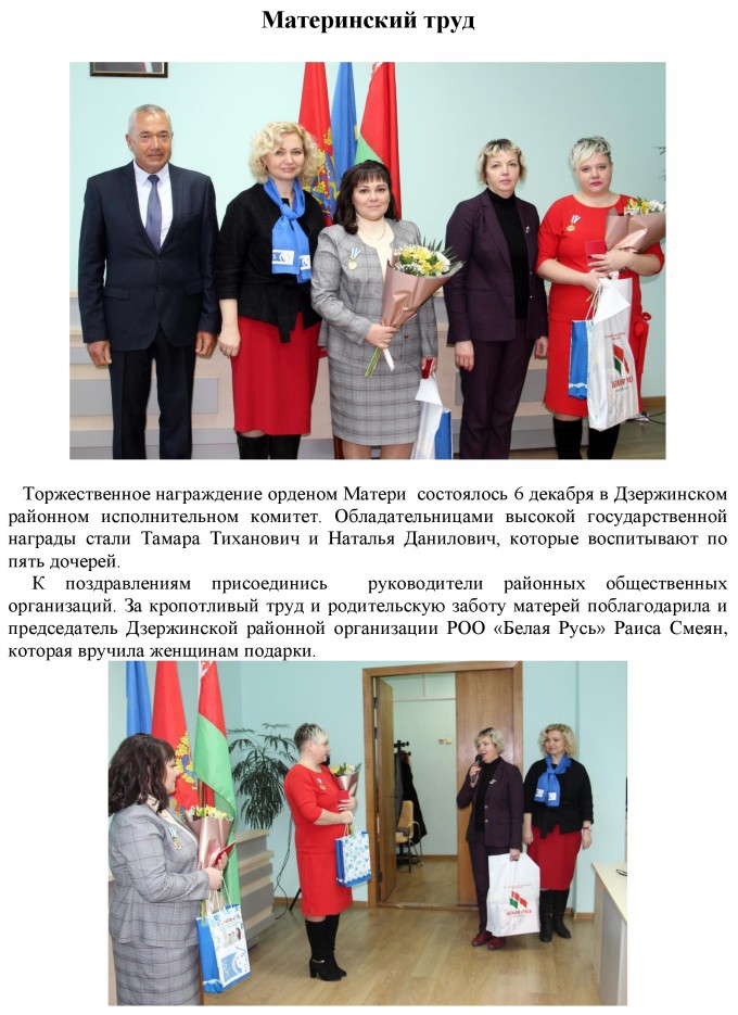 Не осталась в стороне и Дзержинская районная организация РОО «Белая Русь». Женщинам, получивших высокое звание МНОГОДЕТНАЯ МАТЬ, были вручены ценные подарки.