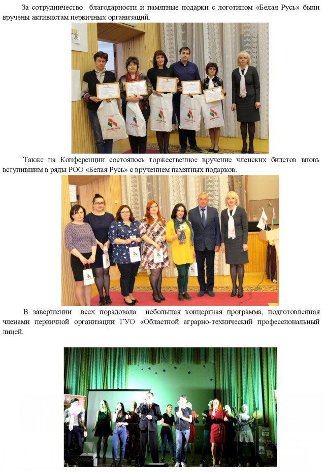 В День Конституции Республики Беларусь отчётно-выборное собрание прошло в первичной организации ГУО «Областной аграрно-технический профессиональный лицей», в ходе которого председатель первички Светлана Осипова выступила с отчётным докладом, отметив, что члены организации принимали на протяжении отчётного периода активное участие в большинстве проектах, организуемых Дзержинской районной организацией РОО «Белая Русь». Это смотр-конкурс «Славим землю трудом, где родились и живём», «Белая Русь»- с профессионалами», «Белая Русь» - украшает Беларусь». За отчётный период первичка существенно выросла. В состав её входят самые активные и ответственные люди, готовые принимать участие во всех мероприятиях и акциях. На собрании присутствовала председатель Дзержинской районной организации Раиса Смеян. Она обратилась с приветственным словом к участникам собрания. В этот же день прошел приём в ряды организации. Раиса Смеян поздравила новых членов первички, а это Анастасия Сорока, Максим Щёлоков, Ольга Заянчковская, Оксана Котлер и Анастасия Бондаренко, и вручила им членские билеты и памятные подарки от ДзРО. Единогласно работа первичной организации лицея признана удовлетворительной. А Светлана Осипова - избрана её председателем.